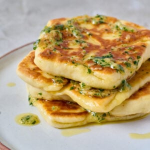 - Drizzle: Transfer the flatbread to a plate and drizzle with lots of garlic butter while it’s still warm. Serve immediately.
