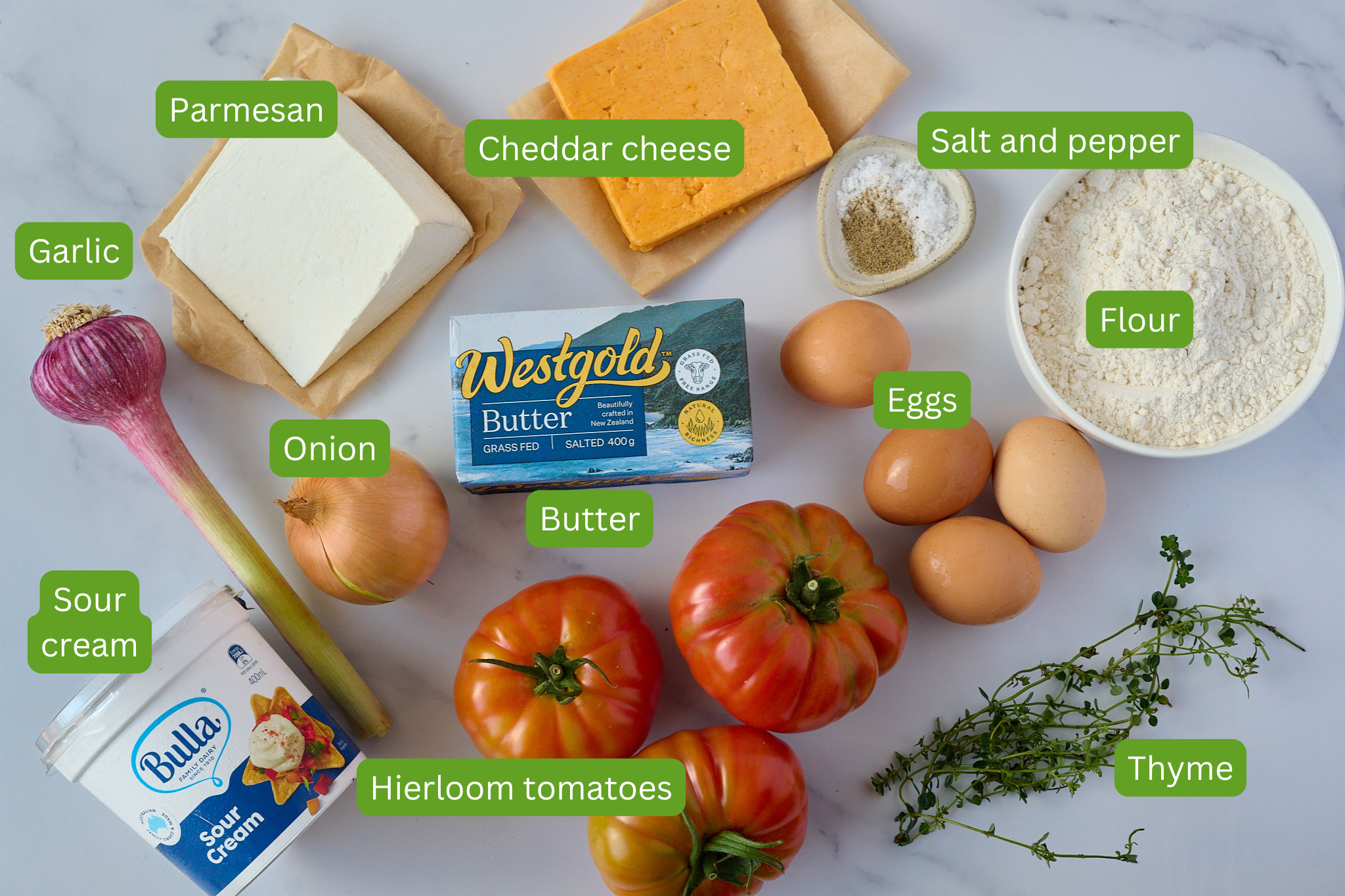 - Heirloom tomatoes: While you could use any variety of tomato for this tart, heirloom tomatoes are the prettiest! Just be sure to salt them first — they hold a lot of water, and this quick step helps keep your pastry crisp and perfect.