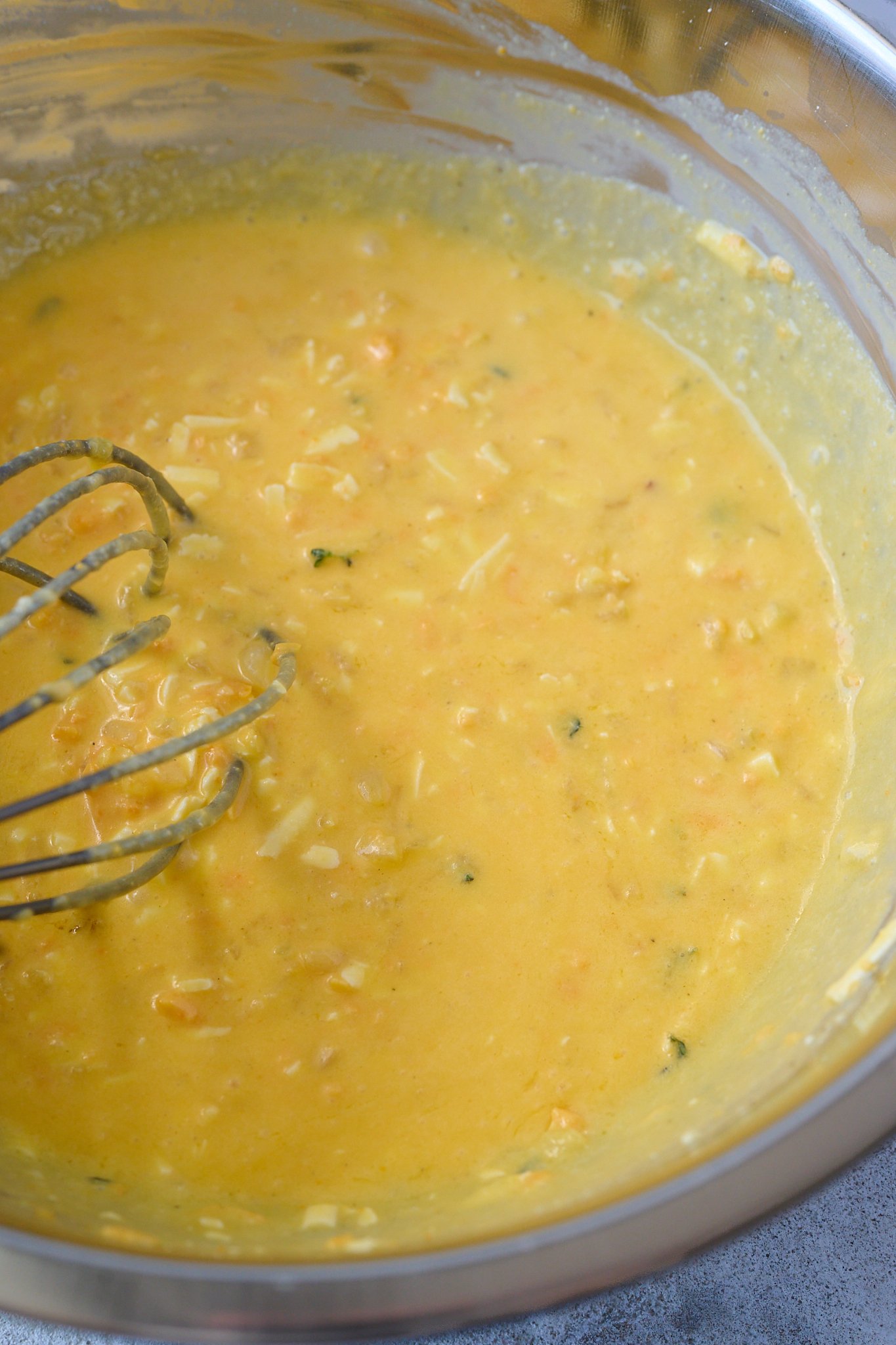 Step 4: In a small mixing bowl, add the eggs, cream, red cheddar, onion mixture and season with salt and pepper. Whisk through until everything is well combined.