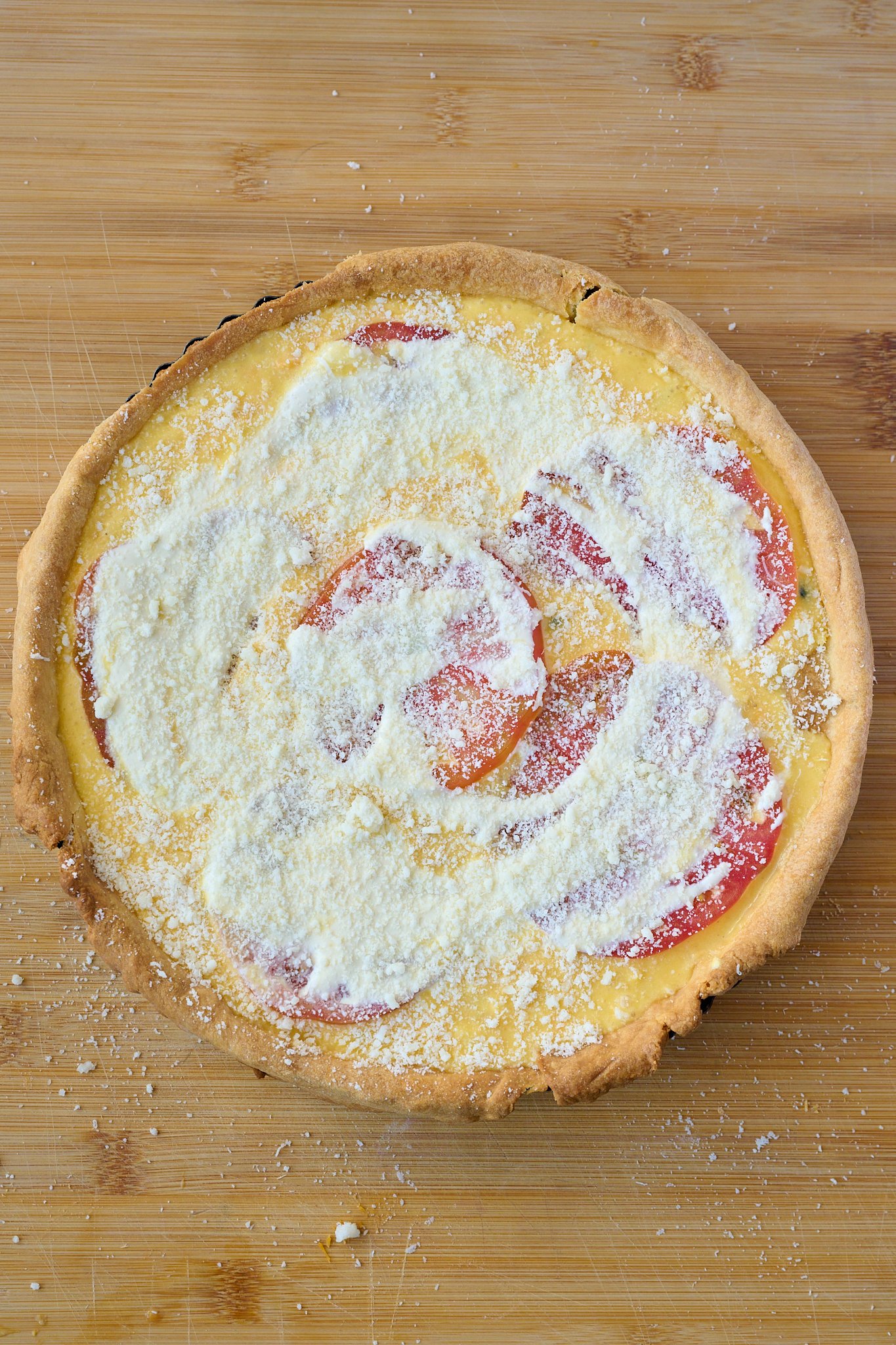 Step 5: Add the filling to the cooled tart shell then layer the sliced tomatoes on top. Drizzle over the sour cream and sprinkle over the parmesan.