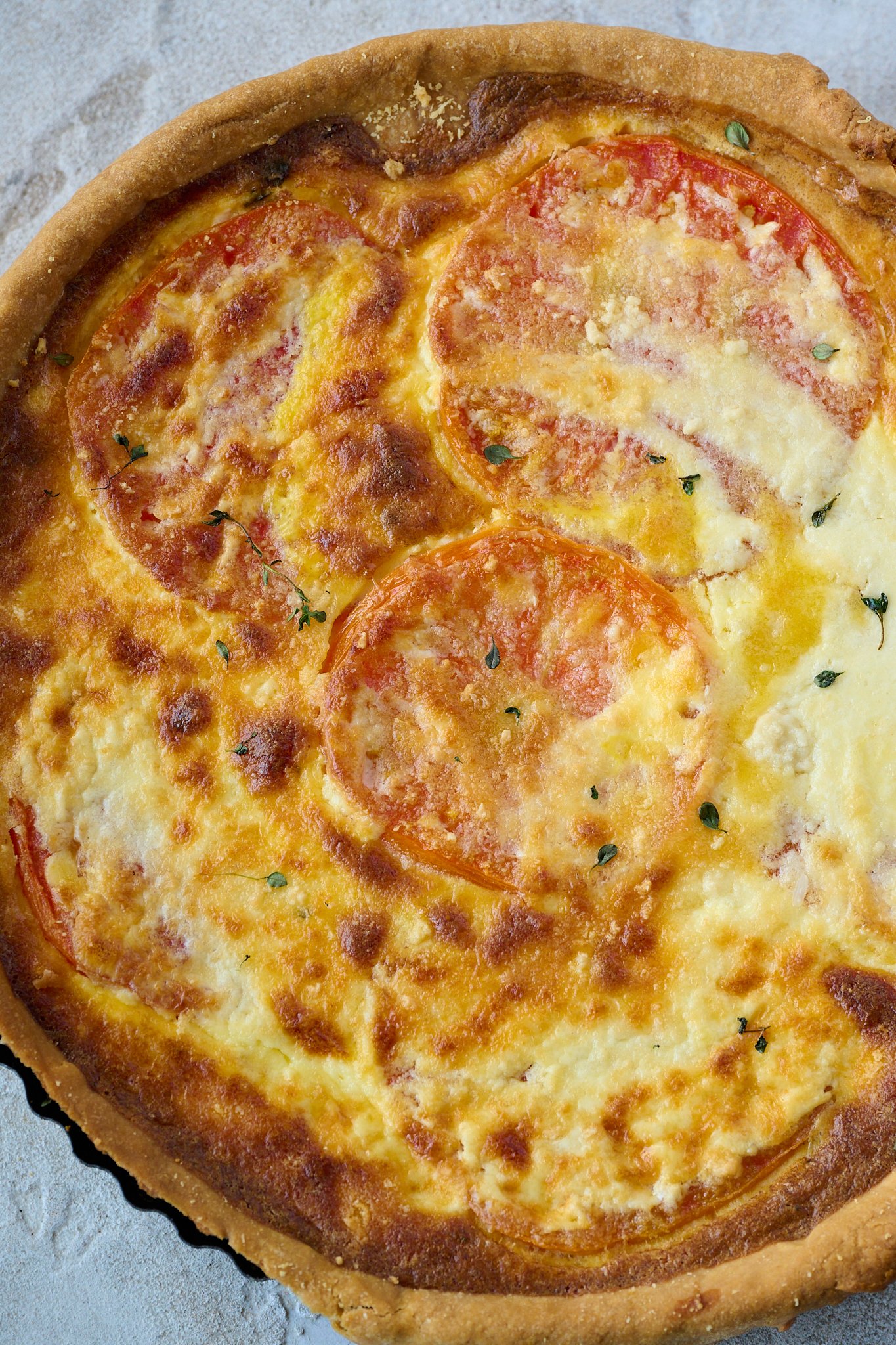 - Bake: Add the filling to the cooled tart shell then layer the sliced tomatoes on top. Drizzle over the sour cream and sprinkle over the parmesan. Bake for 40 – 50 minutes or until the tart is no longer jiggly and is completely set. Remove from the oven and allow to cool for at least 15 minutes before slicing into it. Sprinkle with a little extra thyme before serving.