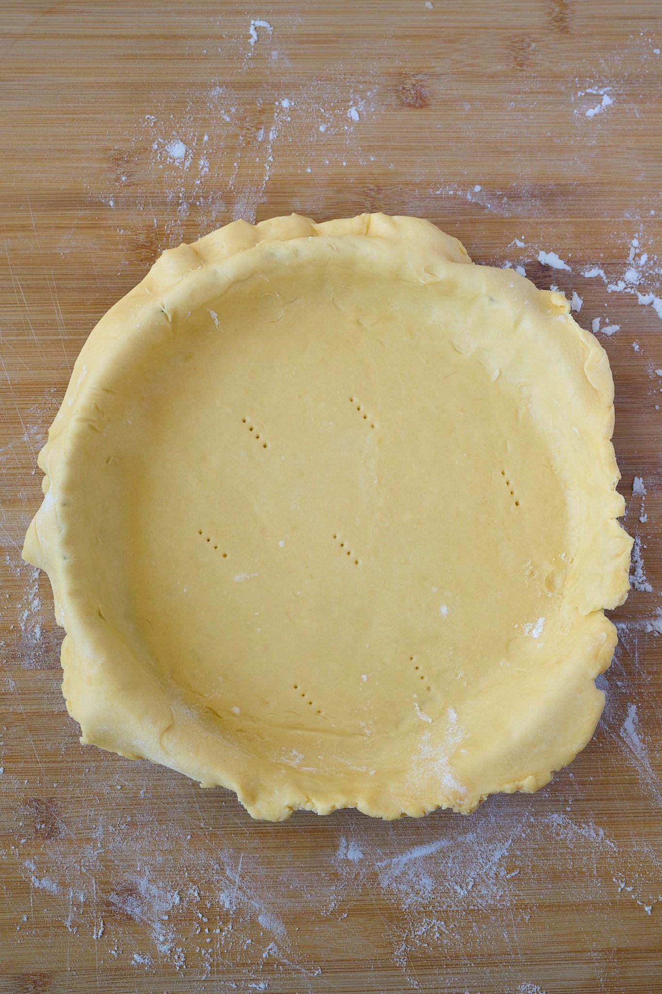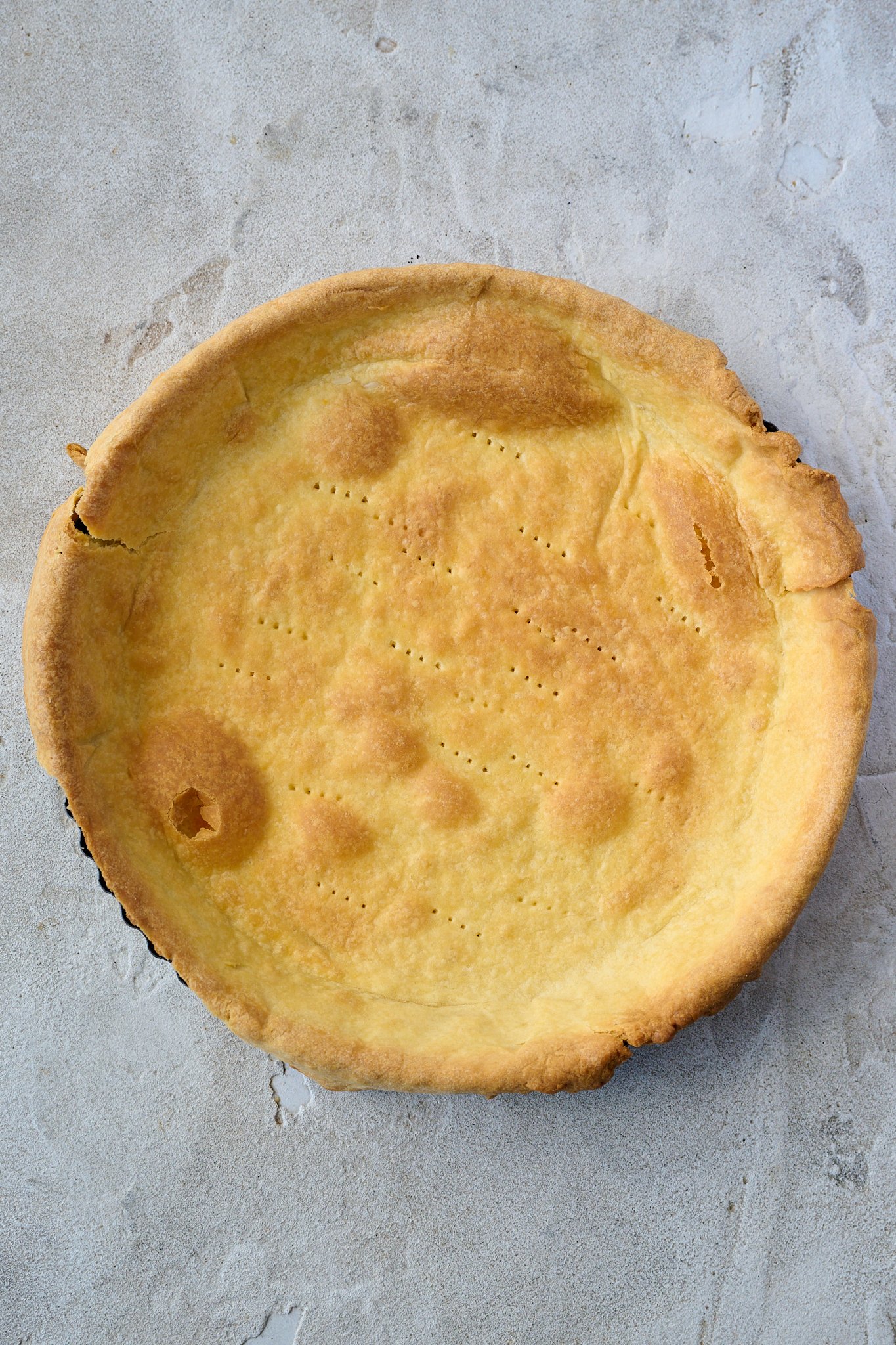 - Bake pastry: Remove the pastry from the fridge, dust with flour and roll out to a circle that is 2 – 3mm thickness. Roll the pastry onto your rolling pin and roll back over a pie dish or tart tin that is 9 – 10" / 23 – 25cm. Leave at least 1 – 2cm of excess pastry hanging over the edges as the pastry will shrink when baking. Using a fork, poke holes into the bottom of the pastry. Line the pastry with baking paper and add baking beads or rice into it so the pastry does not puff up. Bake for 20 minutes. When the crust is starting to become golden, remove the baking beads or rice and continue to bake for a further 20 minutes or until the pastry is fully golden all over. Remove from the oven and allow to fully cool.