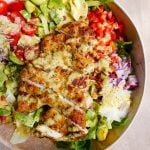In a large bowl combine all ingredients and toss together. Slice the crumbed chicken and place on top. Serve immediately.